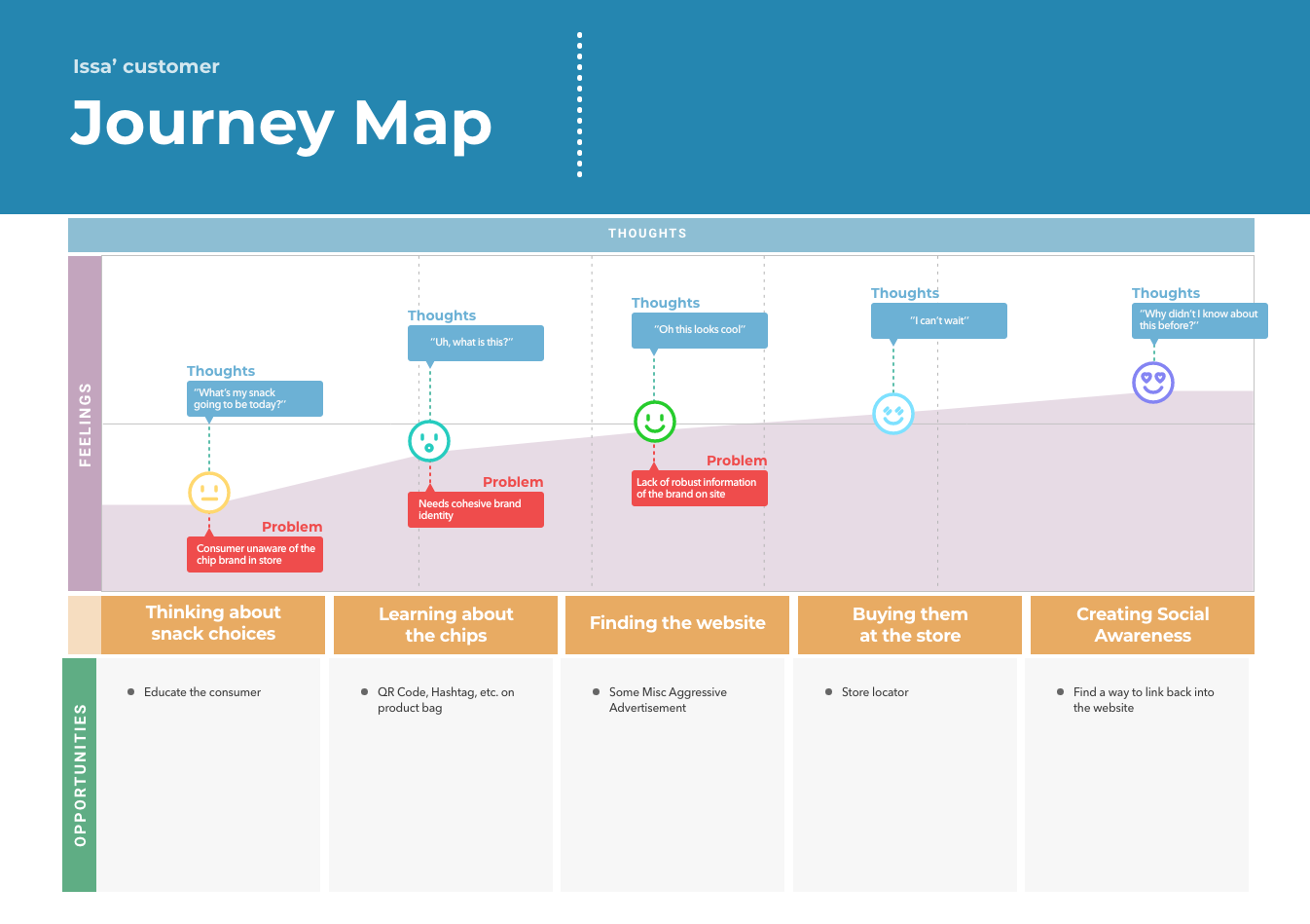Following the last example, the the User Journey will help identify key problem areas that need to be addressed for our snack man, Snacking Sam.